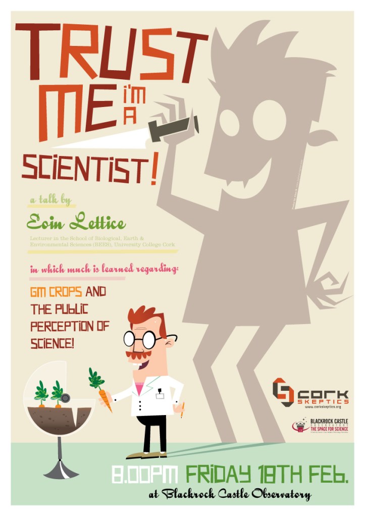 On Friday 18th February, we will host a talk by Eoin Lettice entitled Trust Me, I’m A Scientist: Gentically Modified (GM) Crops and the Public Perception of Science.