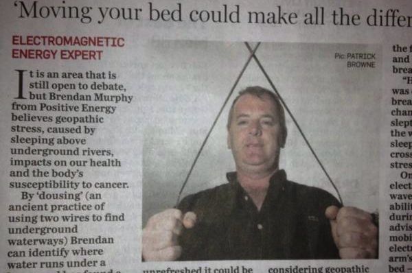 A health supplement in the Irish Independent had the Internet up in arms on Thursday. Once of the stories related to a man who believes that he could use dowsing to identify and ward against cancer. Brendan Murphy from “Positive Energy” says that a phenomenon known as “geopathic stress” can impact on your susceptibility to cancer. According to a blurb on Murphy’s website: