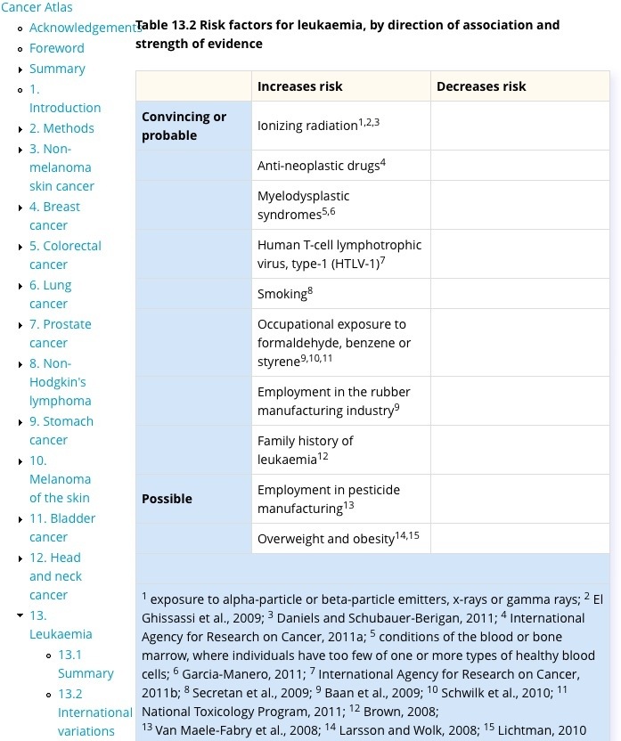 The leukaemia risk factors mentioned make no reference to water fluoridation. Ionising radiation is a strong risk factor, as are certain types of drugs or viruses.